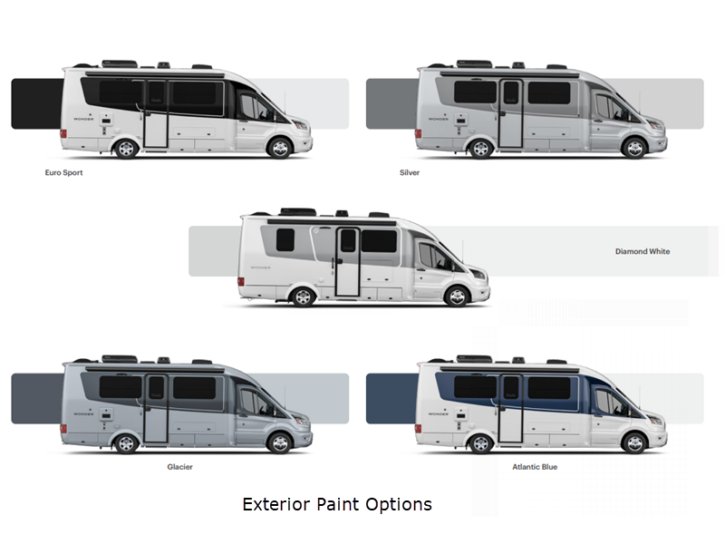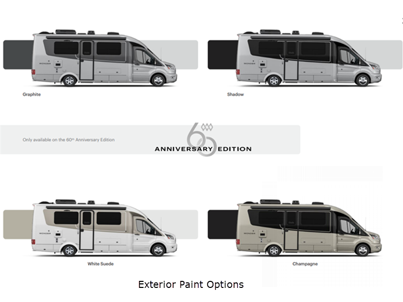 Sleeps 2 Length 24 ft 9 in Ext Width 7 ft 11 in Ext Height 10 ft Int Height 6 ft 3 in Interior Color Dove, Sand, Clay, Cool Ice (60th Anniversary Edition) Exterior Color Euro Sport, Silver, Graphite, Shadow, Glacier, Atlantic Blue, White Suede, Champagne, Diamond White (60th Anniversary Edition) GVWR 11000 lbs Fresh Water Capacity 33.5 gals Grey Water Capacity 26.4 gals Black Water Capacity 35 gals Furnace BTU 19000 btu Generator 4.0kW Gas Fuel Type Gas Engine 3.5L Eco-Boost V6 Chassis Ford Transit Dual Rear Wheel Horsepower 310 hp Fuel Capacity 25 gals Wheelbase 178 in Available Beds Murphy Torque 400 ft-lb Refrigerator Type Compressor Refrigerator/Freezer Refrigerator Size 6.2 cu ft Convection Cooking Yes Number of Awnings 1 LP Tank Capacity 13.2 gals Water Heater Type Truma AquaGo Comfort Plus AC BTU 13500 btu Basement Storage 15 cu. ft. TV Info Two 27" TVs Awning Info Powered Box w/LED Lights Shower Type Standard Electrical Service 30 amp Similar Floorplans