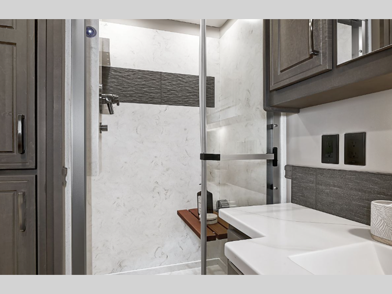The exterior portion of the Explorer is outfitted with an aerodynamic fiberglass, equalizer fully automatic four-point hydraulic leveling system, and a Diamond Shield anti-chip paint protection to keep your unit looking its best. The multiplex control system comes with Bluetooth app control so you can adjust things at the touch of a finger, and the 8kW Onan QD generator will provide you with power. Plus, you'll have to check out the great list of options that will make your Explorer even more adventure-worthy.